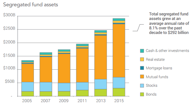 "保本基金(Segregated Funds,又译为“分隔基金”)"在加拿大是于1961年开始由人寿保险公司提供。这种保险公司版的互惠基金,与投资公司的互惠基金,有一些相似性,但也有许多重要差别。 (右图:加拿大市场过去十年保本基金的增长变化,来源:CLHIA,2016)
